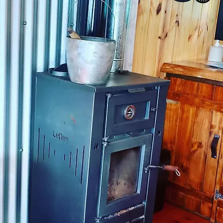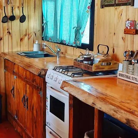 Eine Küche mit einem Kühlschrank, einem Toaster und einem Herd wird in der Cabanas Los Nires angeboten.